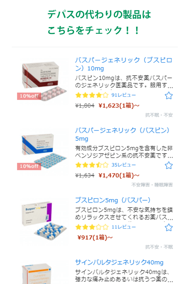 デパス以外の抗不安薬や睡眠薬は今でも個人輸入可能なものがあり、代替薬としてバスパー(有効成分ブスピロン)を購入される方が多いです。